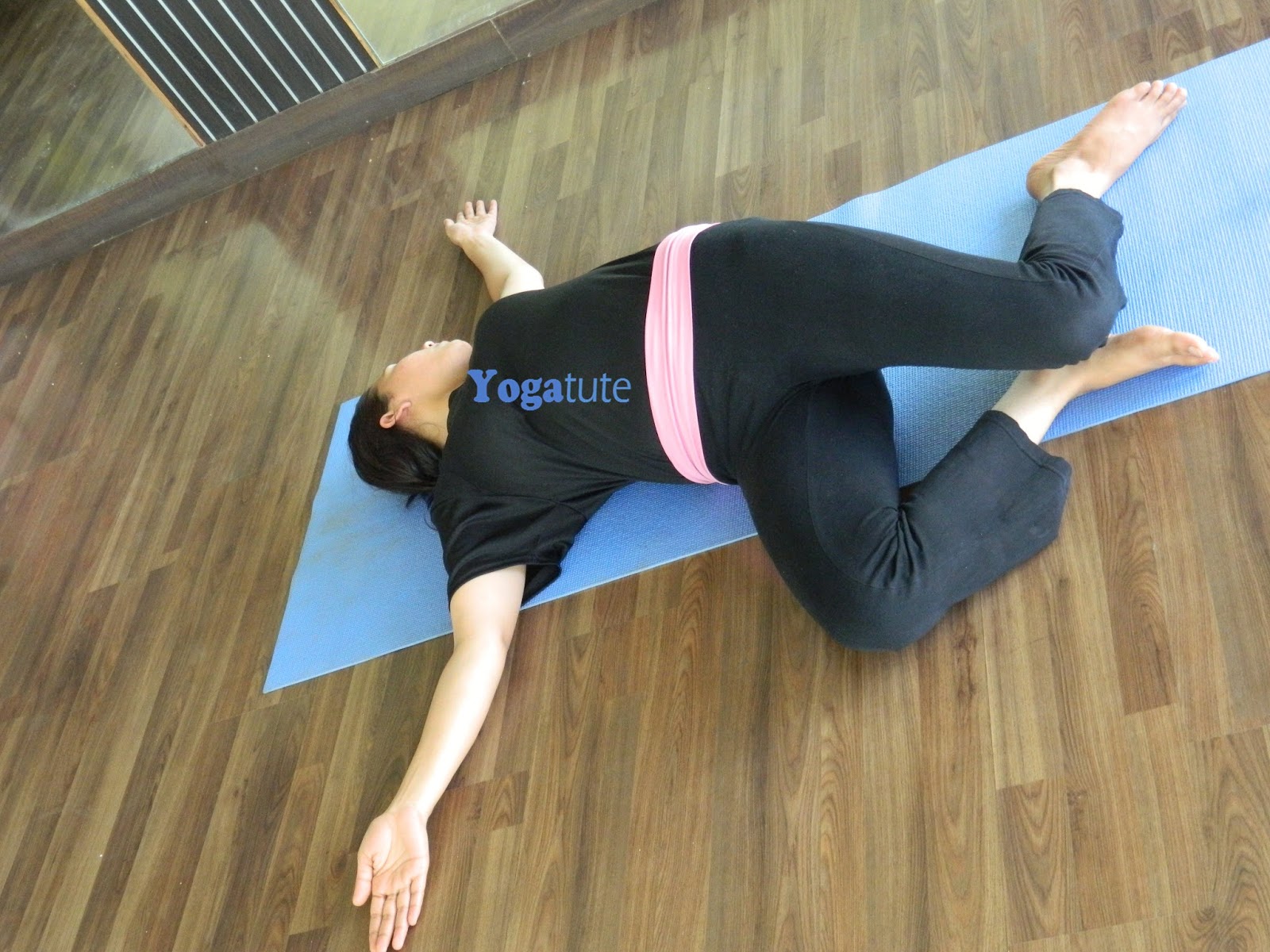 4. While breathing in, turn your legs towards right, right knee resting on the ground, and left knee above the heel and toe of the right leg.